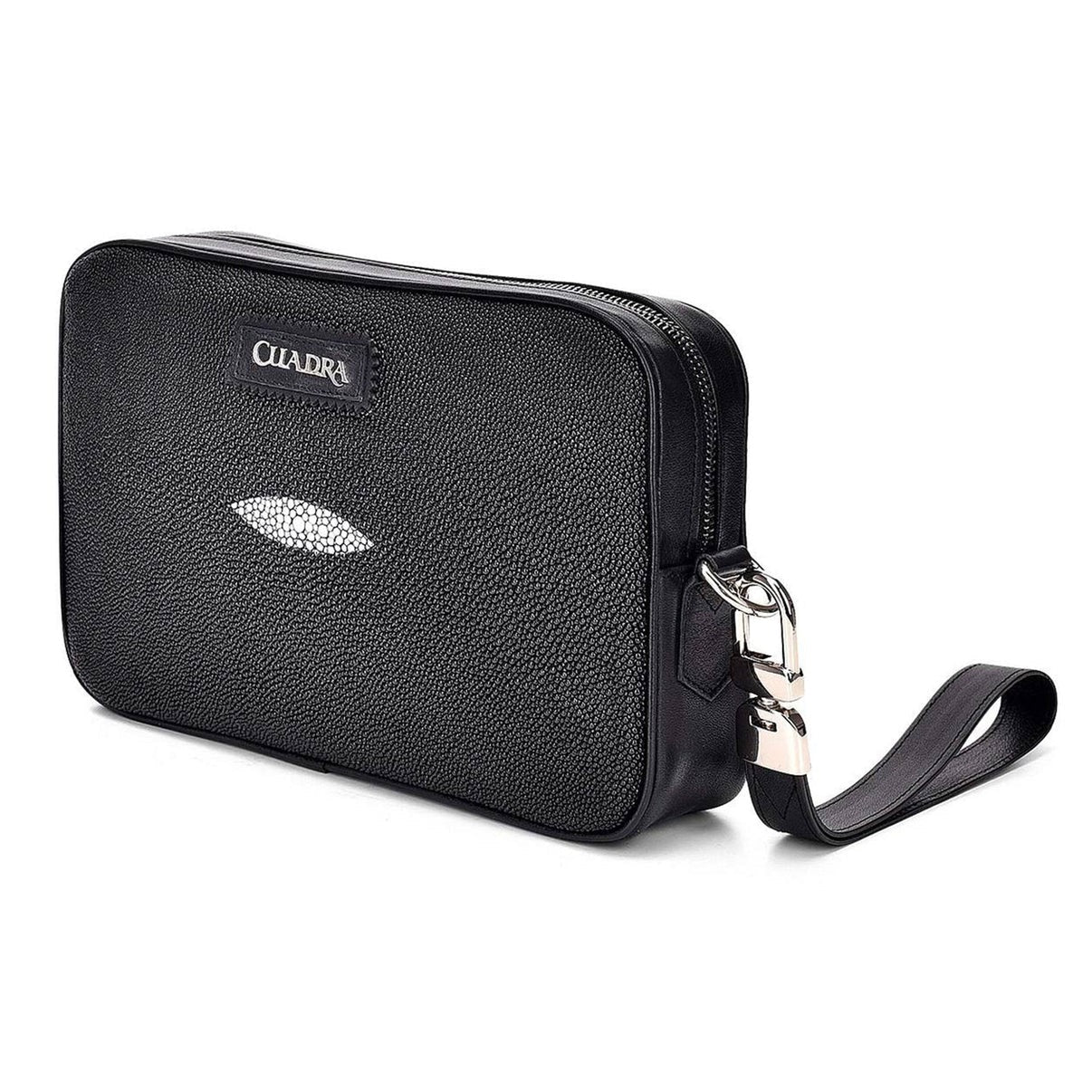 Introducing the Black Leather Document Bag by Cuadra, a sleek and versatile accessory for the modern gentleman. Crafted from genuine stingray leather on the front and bovine leather on the back, it offers a striking contrast. The iconic metallic Cuadra logo adds sophistication.
