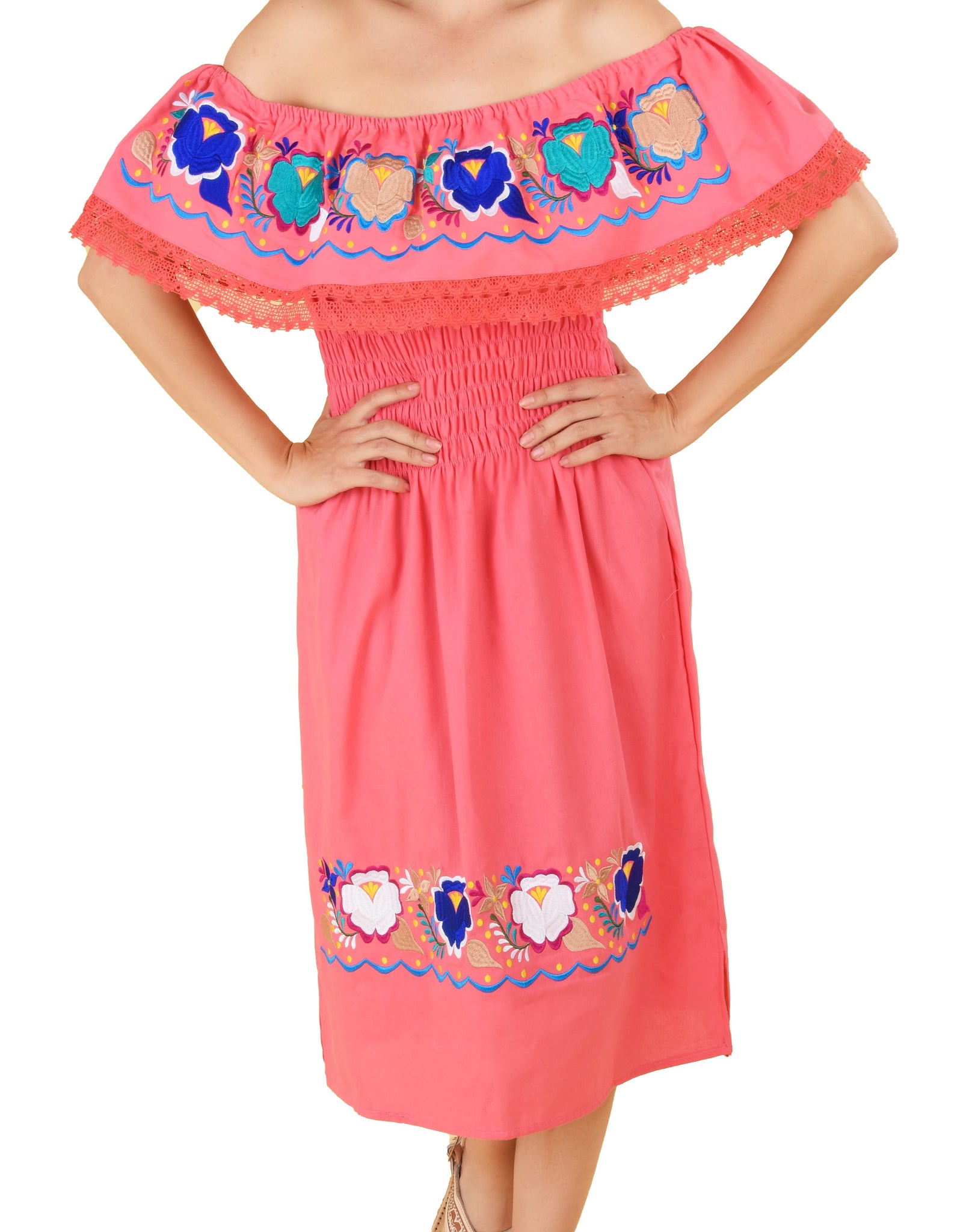 Womens Traditional Embroidered Manta Off Shoulder Dress Floral Loop Peach