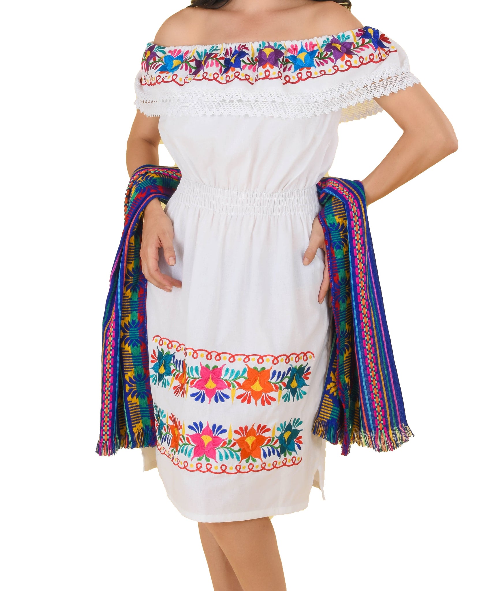 Womens-Traditional-Embroidered-Manta-Off-Shoulder-Dress-Floral-Loop-White