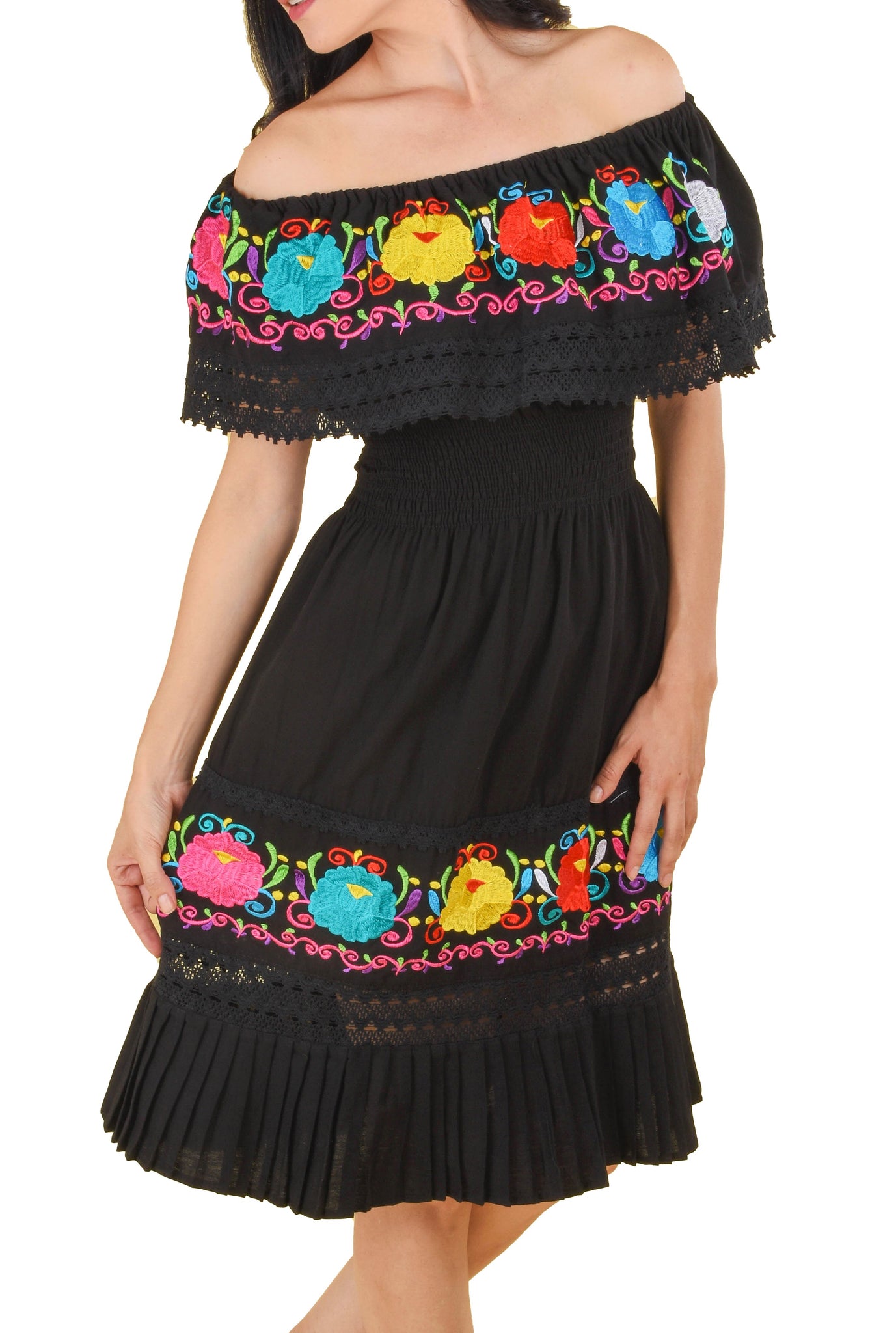 Womens Traditional Embroidered Manta Off Shoulder Pleated Bottom Dress Floral Black