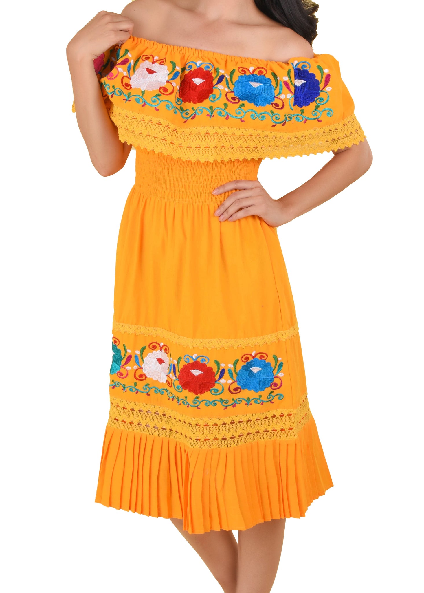 Womens Traditional Embroidered Manta Off Shoulder Pleated Bottom Dress Floral Orange