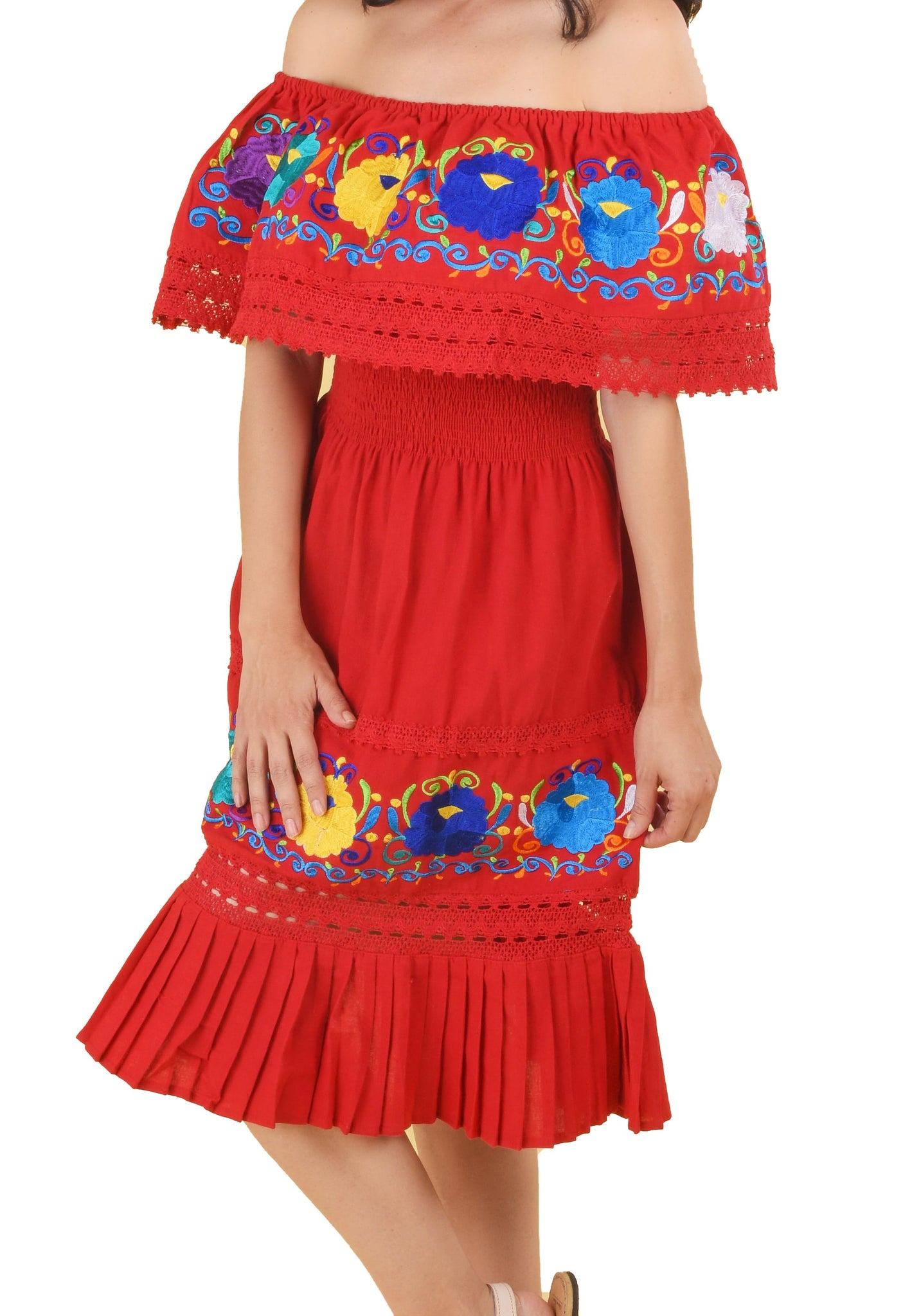 Womens Traditional Embroidered Manta Off Shoulder Pleated Bottom Dress Floral Red