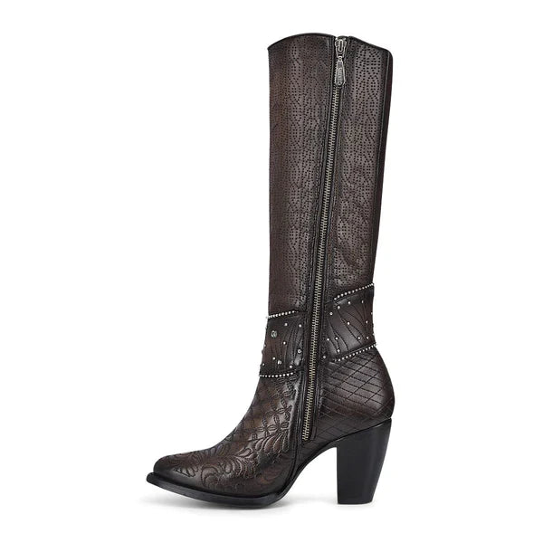 Cuadra black and brown Parid Texas fashion cowgirl boots for women. Genuine cowhide leather round toe cowgirl boots for women. Laser cut details and studs on the shaft. Best handmade boots with Goodyear welt construction. Leather lining and nonslip sole. Made in Leon Mexico.